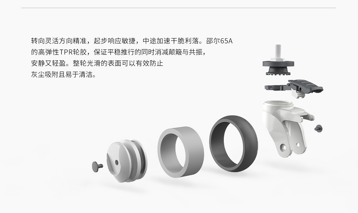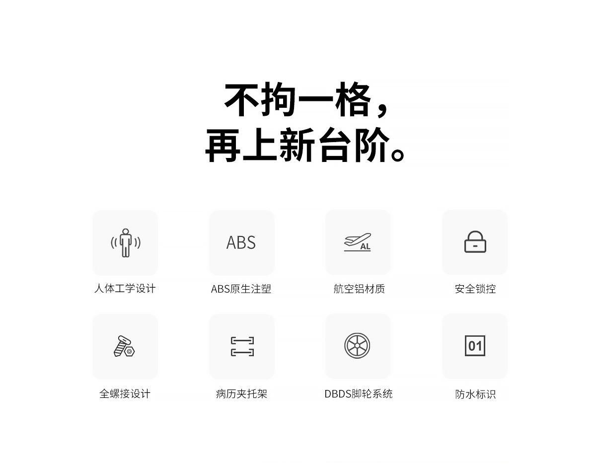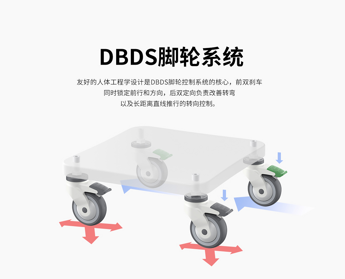 10.搭载4寸双刹车医疗级静音脚轮,PA6材质轮架,优于十倍钢制结构同品,永不生锈;精密滚珠深沟轴承,运行精度高,直行转弯平稳准确;