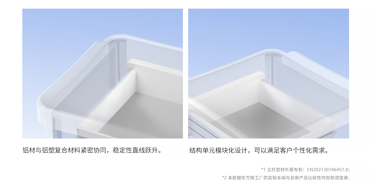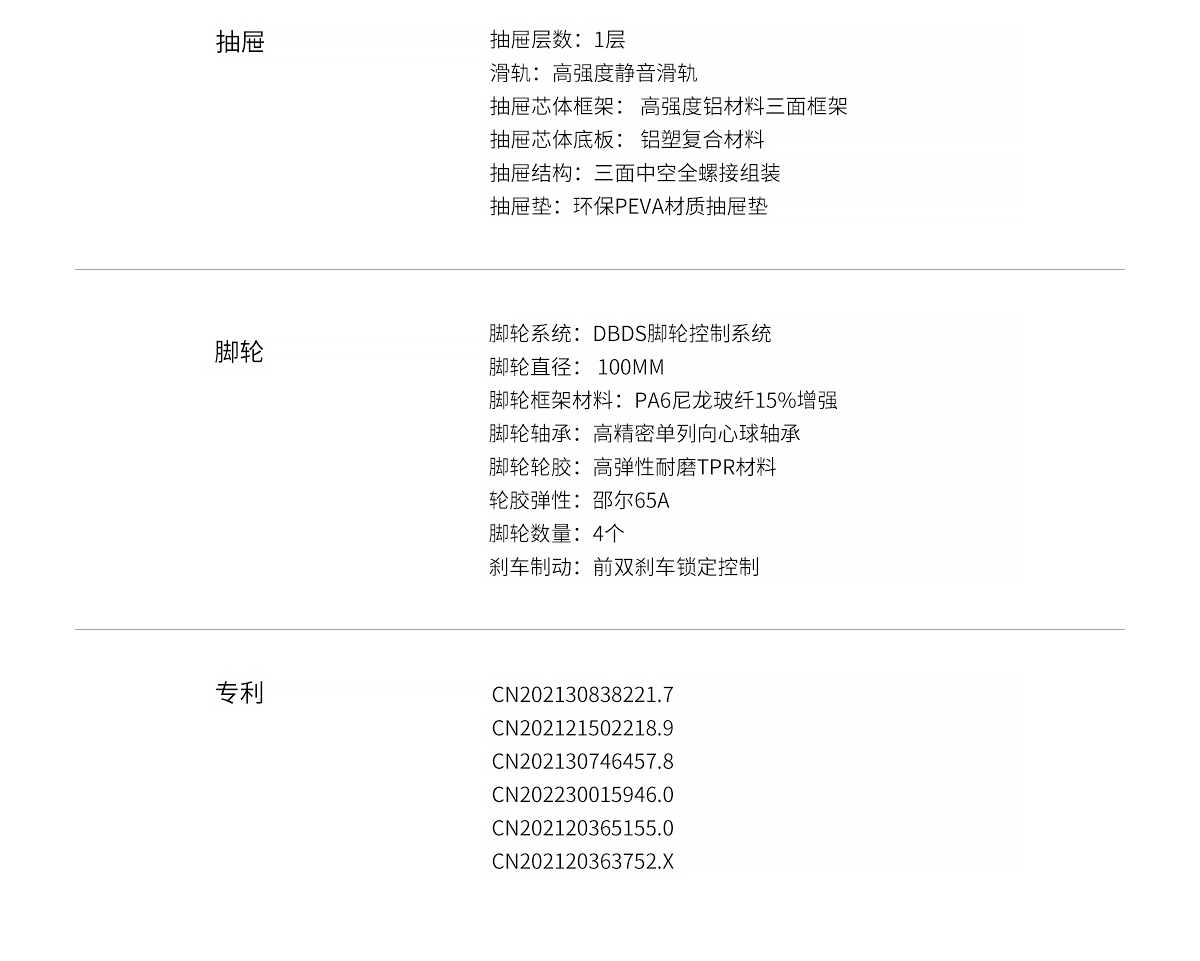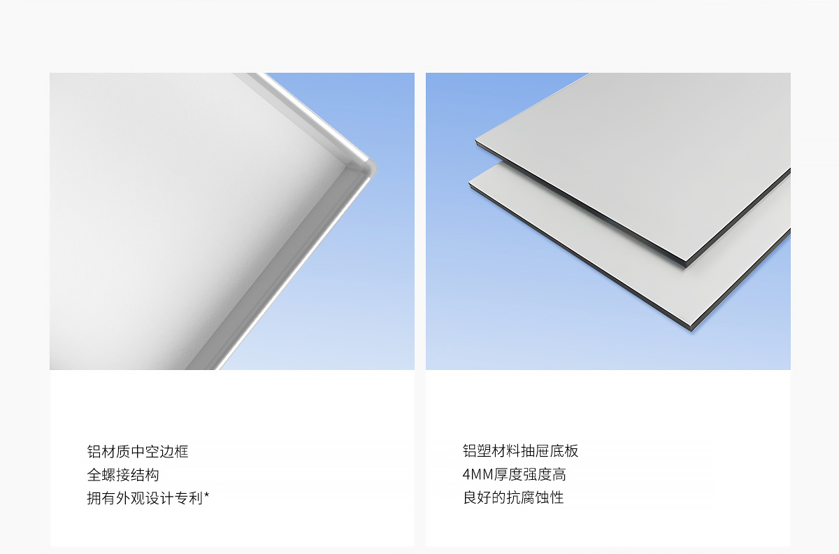 6.抽屉基于轻量化设计,芯体采用全铝材料,三面中空结构螺接安装,底板铝塑复合板,强度大,承重强,支撑性好;
