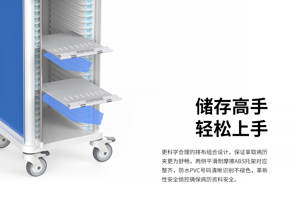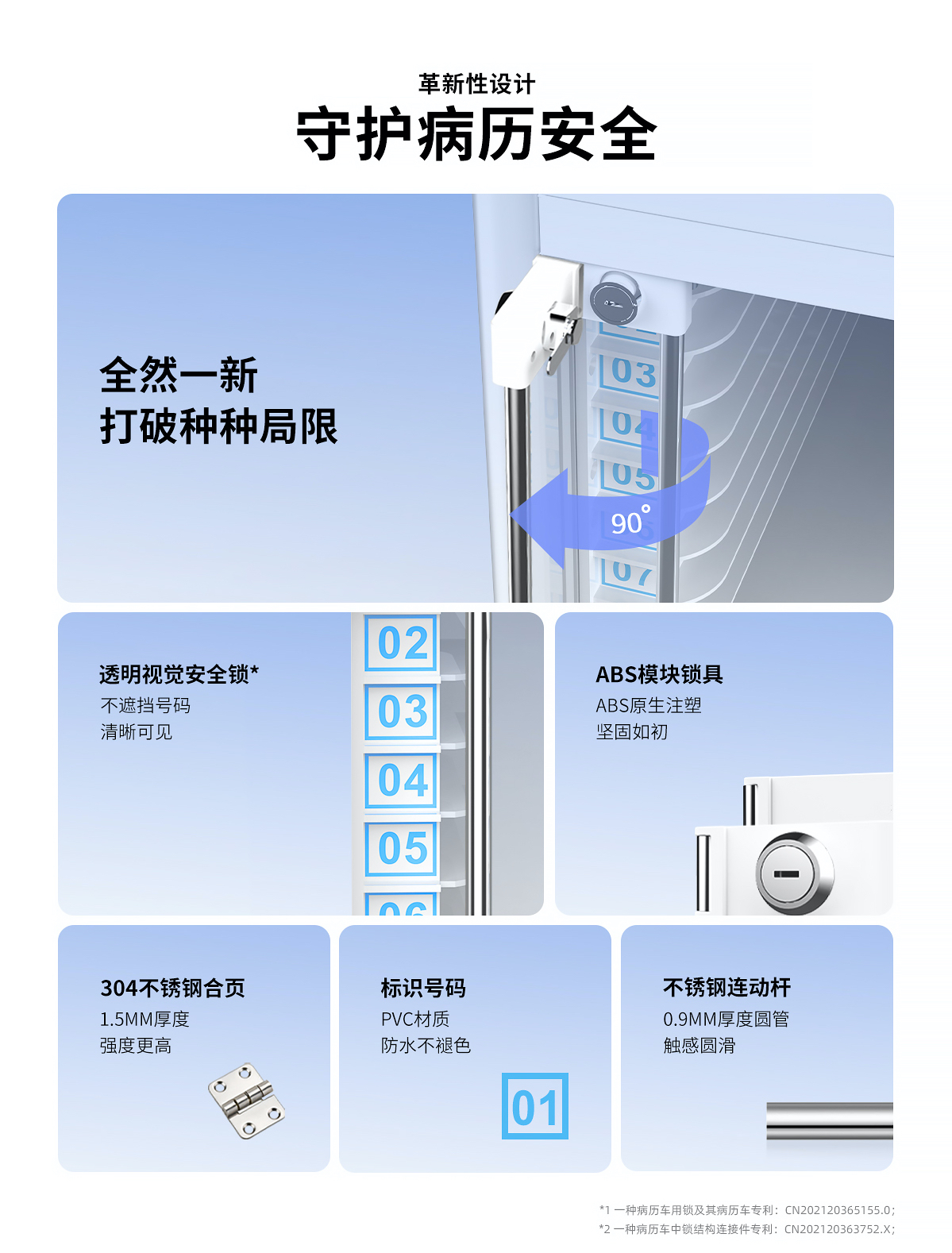 9.安全锁控两个国家实用新型专利加持,整体模块化设计,不挡标识,开合更轻松,可拆卸式配件,更换方便,随时确保病历资料安全;