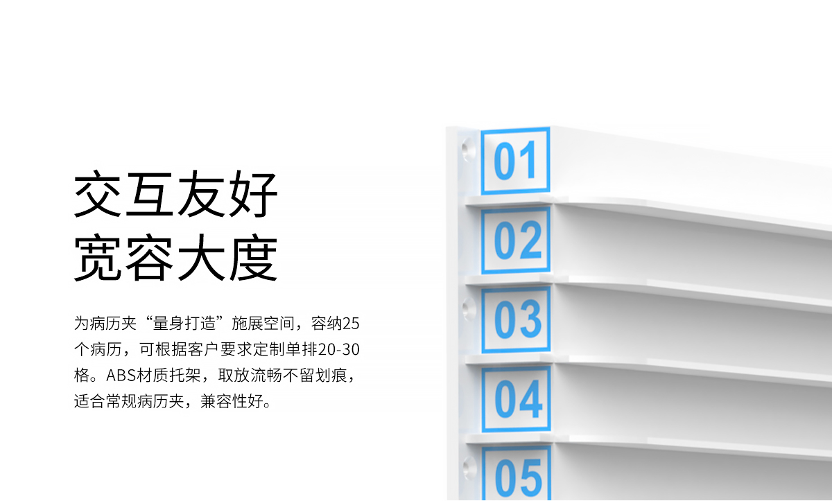 8.ABS材料病历托架,适用大多数常规病历夹尺寸,可以容纳25个病历,且设有防水标识号码,清晰识别不褪色;
