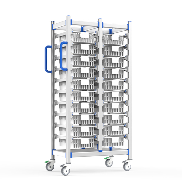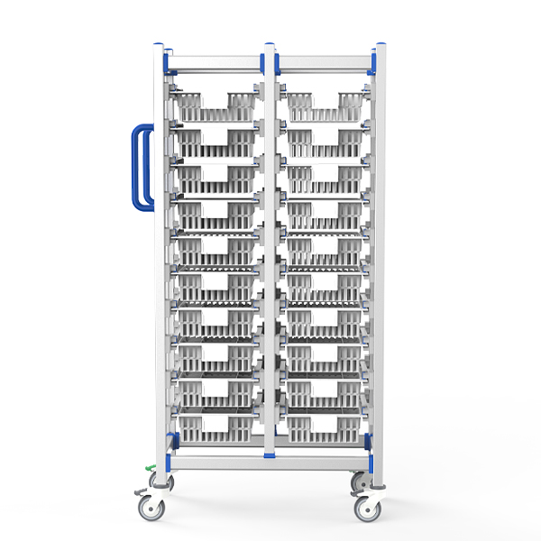 双列耗材推车以阳极氧化铝无孔框架+ABS抗冲击卡扣为核心,双列400×300mm模块化篮筐集成动态分格系统;医用静音脚轮双刹车定向+可调推手支持360°自纠偏长距运输,2°微倾抽拉设计适配高频存取,全维度客制化满足医疗场景高密度防菌存储与精准机动管控需求。