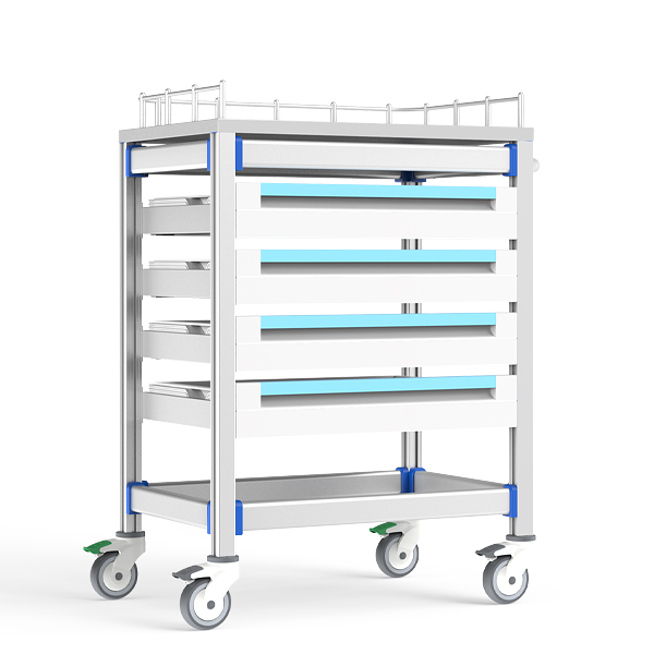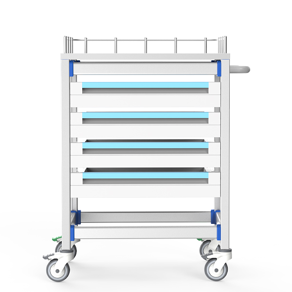 功能耗材推车以阳极氧化铝无孔框架+ABS抗冲击卡扣为核心,集成四层抽屉(自由插片20格分装+透明标签框灵活标识)与静音缓冲滑轨系统;医用脚轮双刹车稳控+三面围栏防滑落,适配高频静音移动场景,全维度客制化满足耗材防菌分拣、精准定位及严苛院感管控需求。